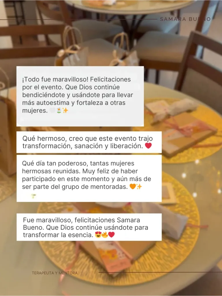 Samara Bueno es mentora de mujeres y cristiana, dedicada a ayudar a las mujeres a encontrar sanación emocional, propósito y dirección espiritual. Ella creó el Kit Mujeres de Esencia para ayudar a aquellas que se sentían inseguras y sin tiempo a dirigir encuentros memorables y llenos de la presencia de Dios.